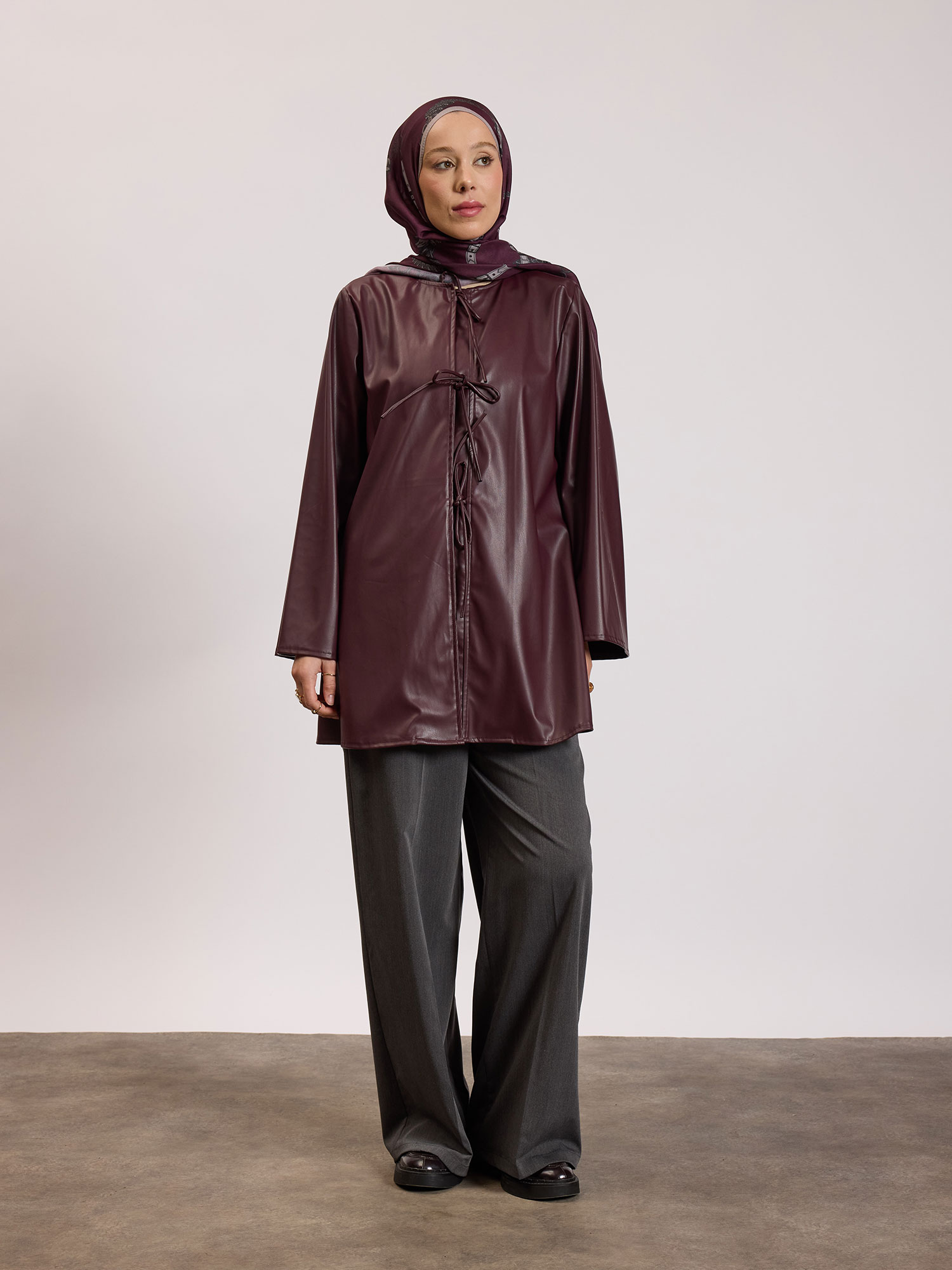 Bağlama Detaylı Uzun Deri Ceket Mürdüm