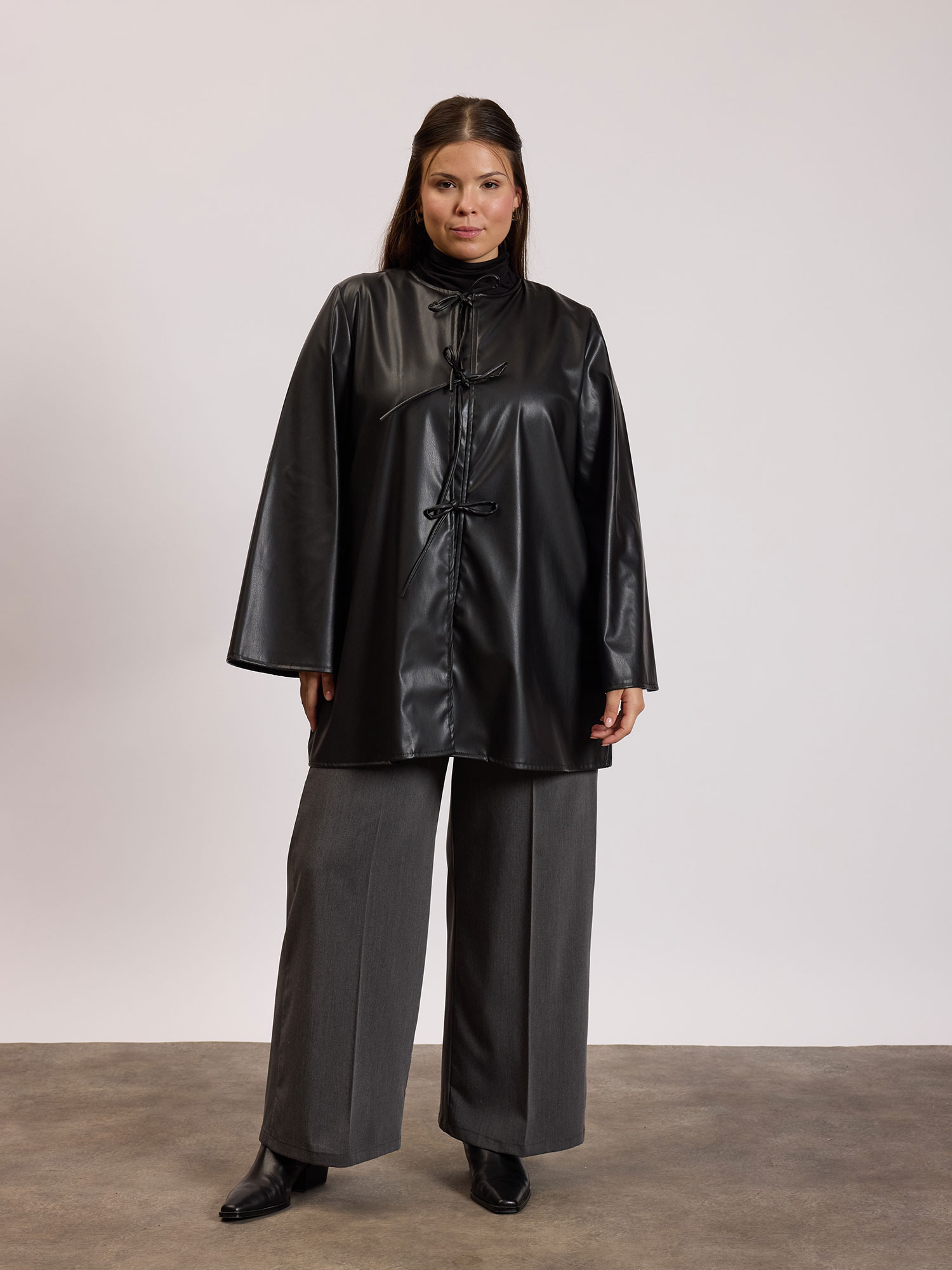 Bağlama Detaylı Uzun Deri Ceket Siyah