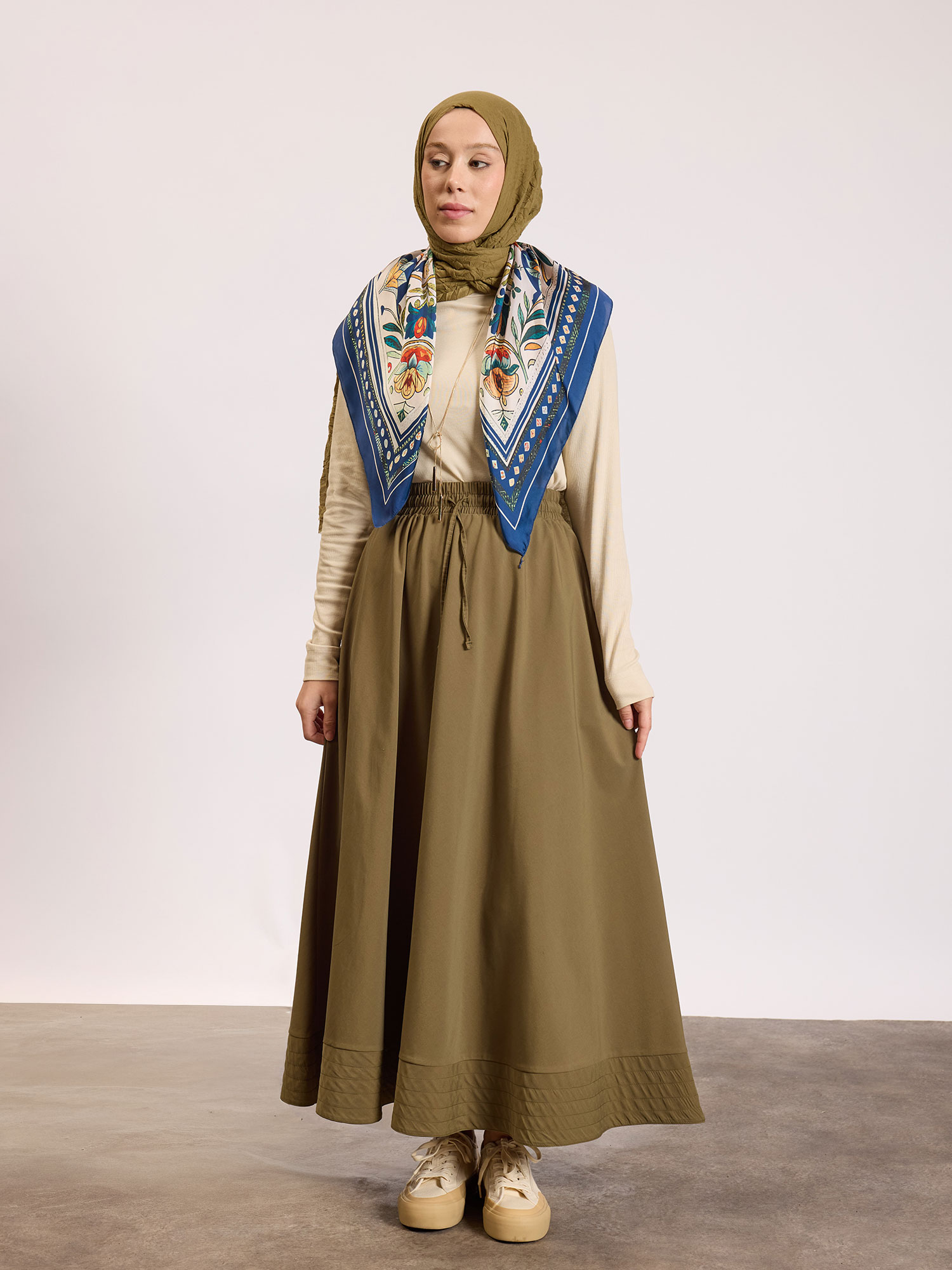 Dikiş Detaylı Beli Lastikli Etek Haki
