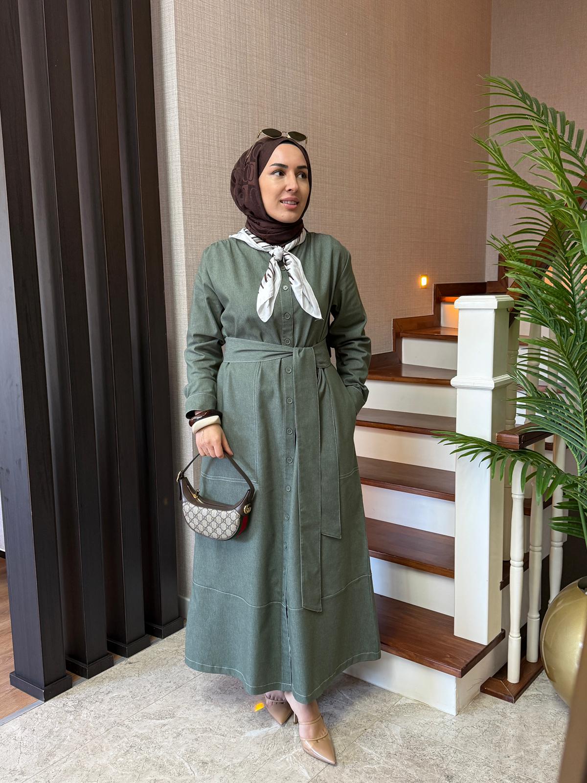 Kontrast Dikişli Kot Elbise Haki