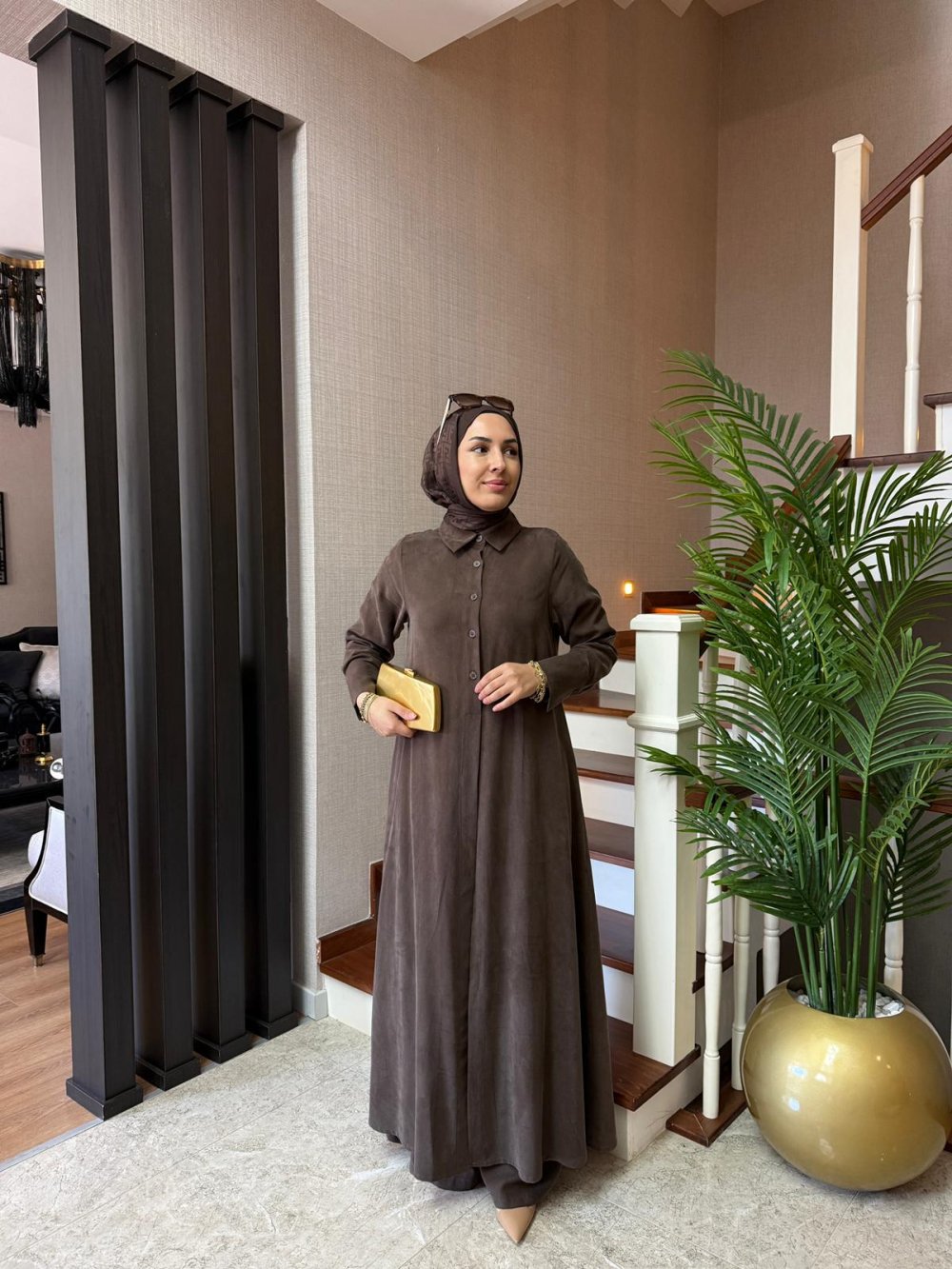 Tunik boy 138 cm’dir. Önde düğme ve yırtmaç detayı mevcuttur.