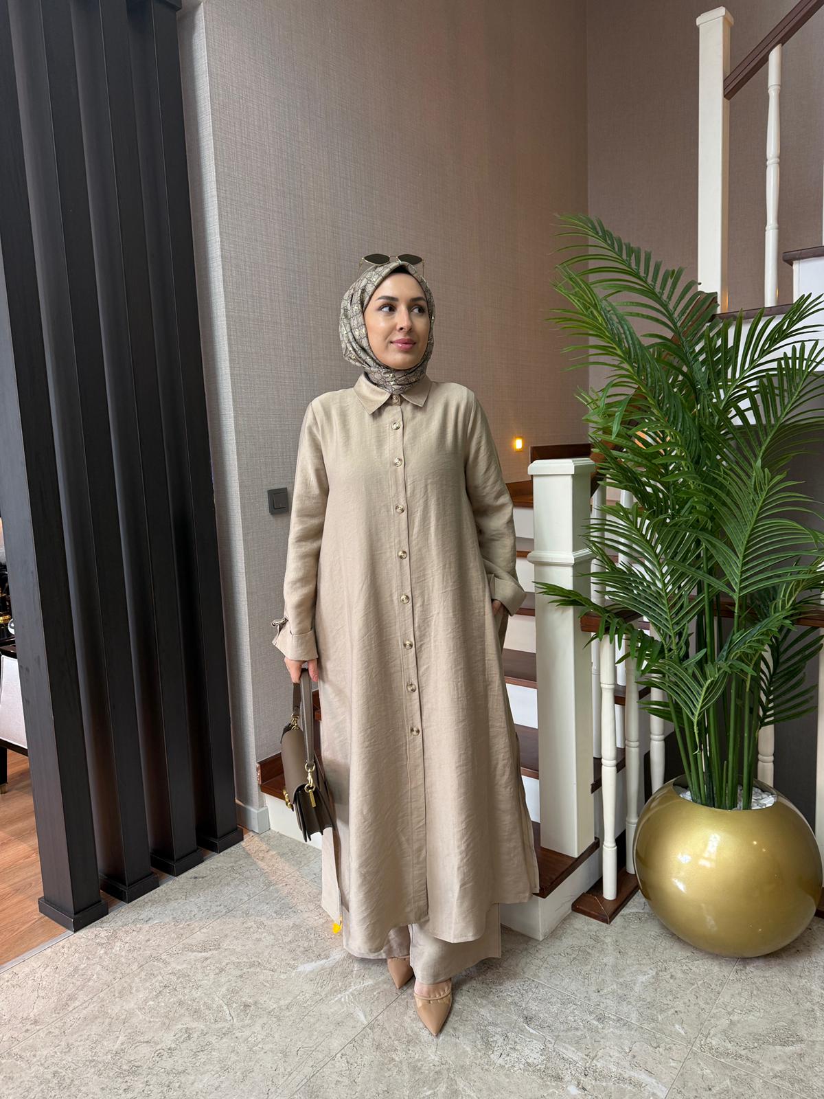 Tunik boy 125 cm’dir. Yanlarda cepleri mevcuttur. Kolları D toka apolet detaylıdır.