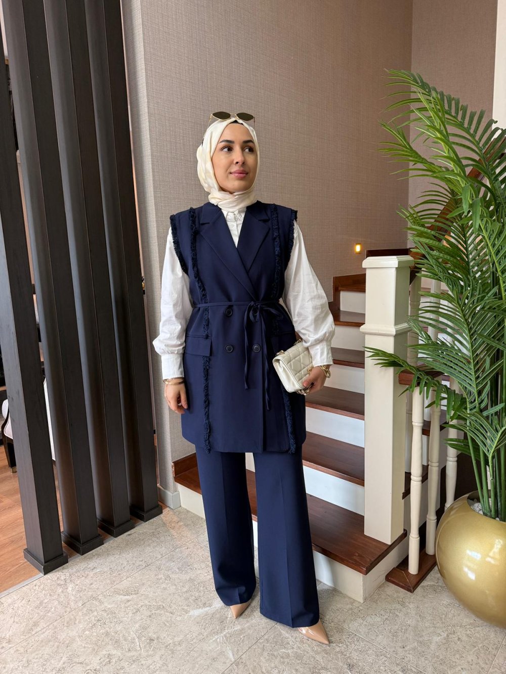 Yelek komple astarlıdır, püskül detaylıdır, boy uzunluğu 85 cm’dir.