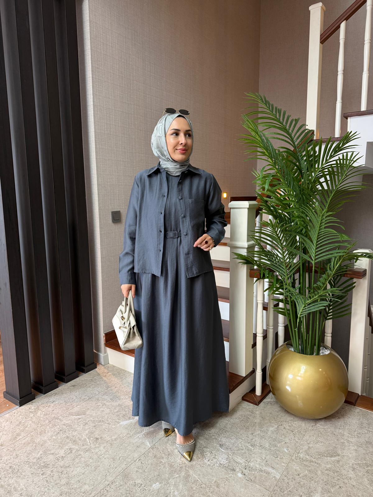 Elbise boy 138 cm’dir, sıfır kollu, arkadan fermuarlı, önünde nervür detayları bulunmaktadır ve kendinden kaplama kemeri mevcuttur.