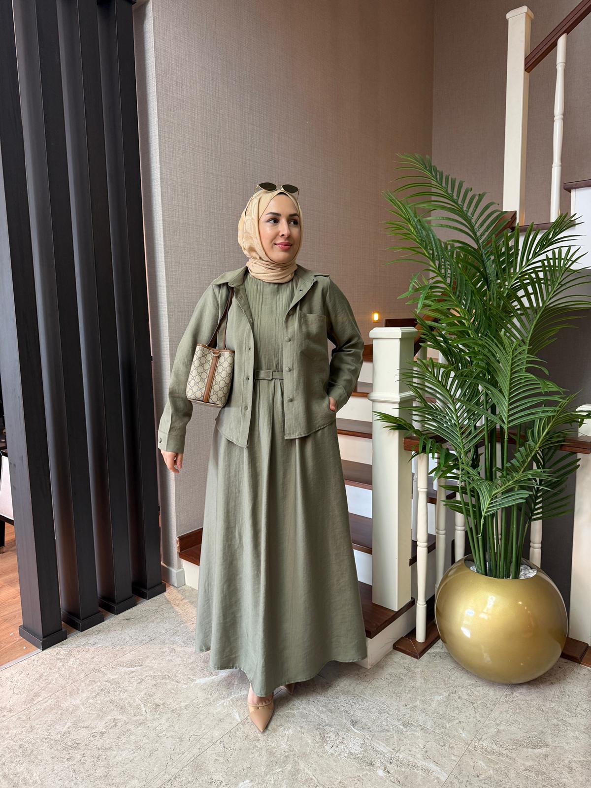 Elbise boy 138 cm’dir, sıfır kollu, arkadan fermuarlı, önünde nervür detayları bulunmaktadır ve kendinden kaplama kemeri mevcuttur.