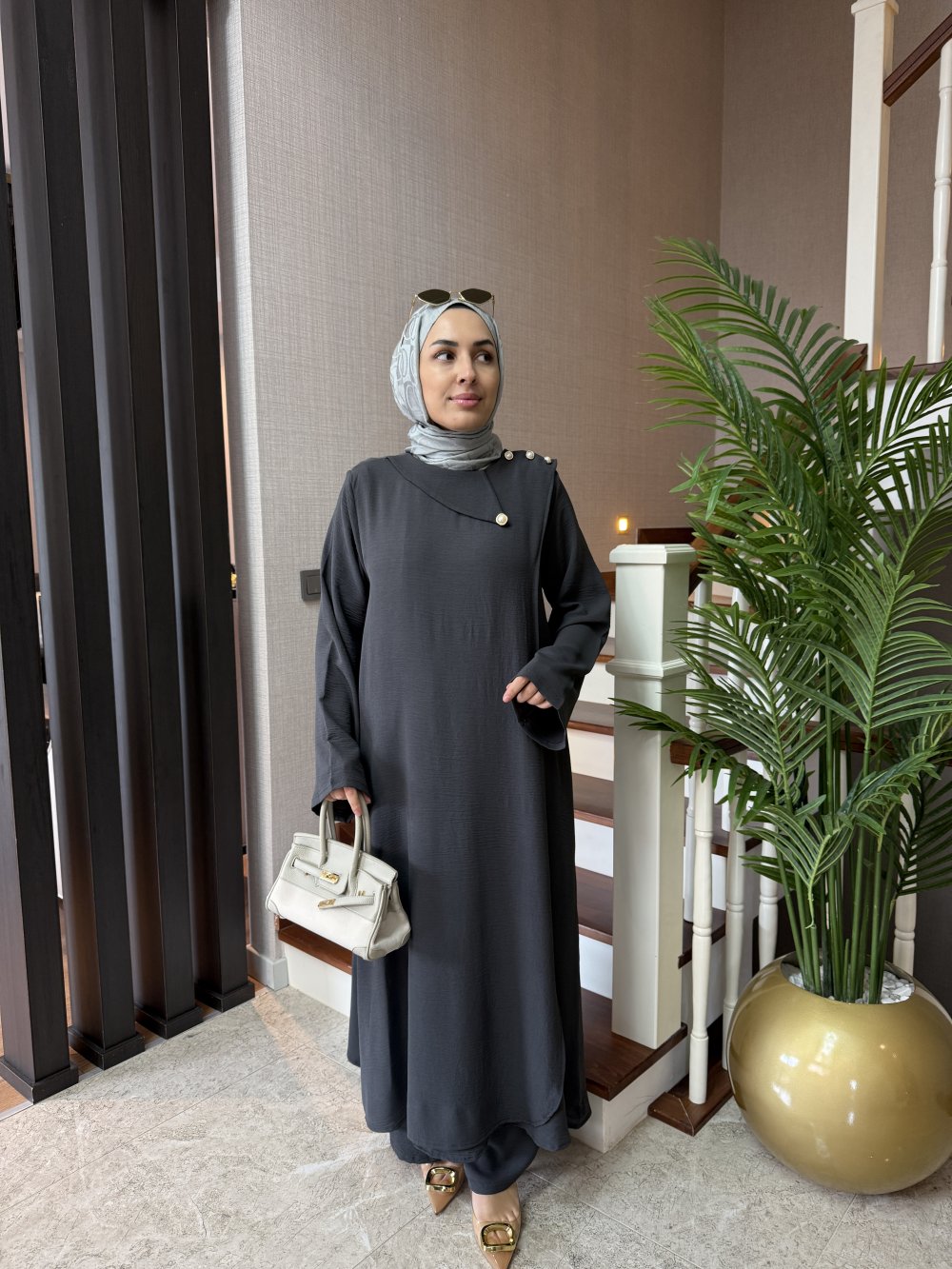 Tunik boy 125 cm’dir. Kruvaze kapama şeklinde gelmektedir, omuzunda düğme detayları mevcuttur.